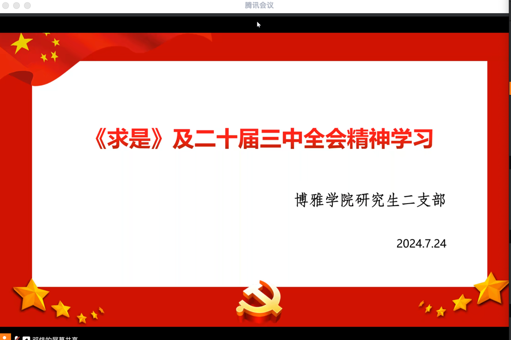 视频网站 研究生二支部开展“共读《求是》杂志,深入学习二十届三中全会精神”主题党日活动为进一步增强支部成员的理论素养,跟进学习党的最新会议精神,2024年7月24日上午9点半,视频网站 研究生二支部通过腾讯会议开展了“共读《求是》杂志,深入学习二十届三中全会精神”线上学习活动。本次活动由高波同志主持,支部全体党员、发展对象及入党积极分子积极参与学习讨论。阅读重要文章,增强党性修养。学习《求是》杂志是紧跟时...