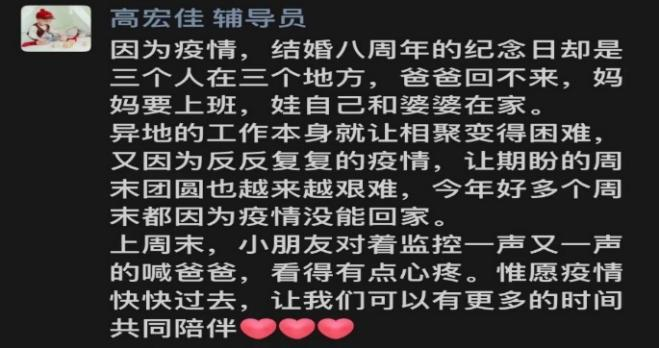 疫情防控之下,每一位坚守岗位为大家服务的抗疫中坚力量,无论是医护人员、志愿者,还是辅导员、行政人员,背后都有着家庭的支持、亲人的理解,他们克服着各种困难,投入在了抗疫第一线。高宏佳和郑家勤老师也是如此。