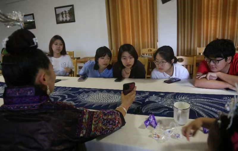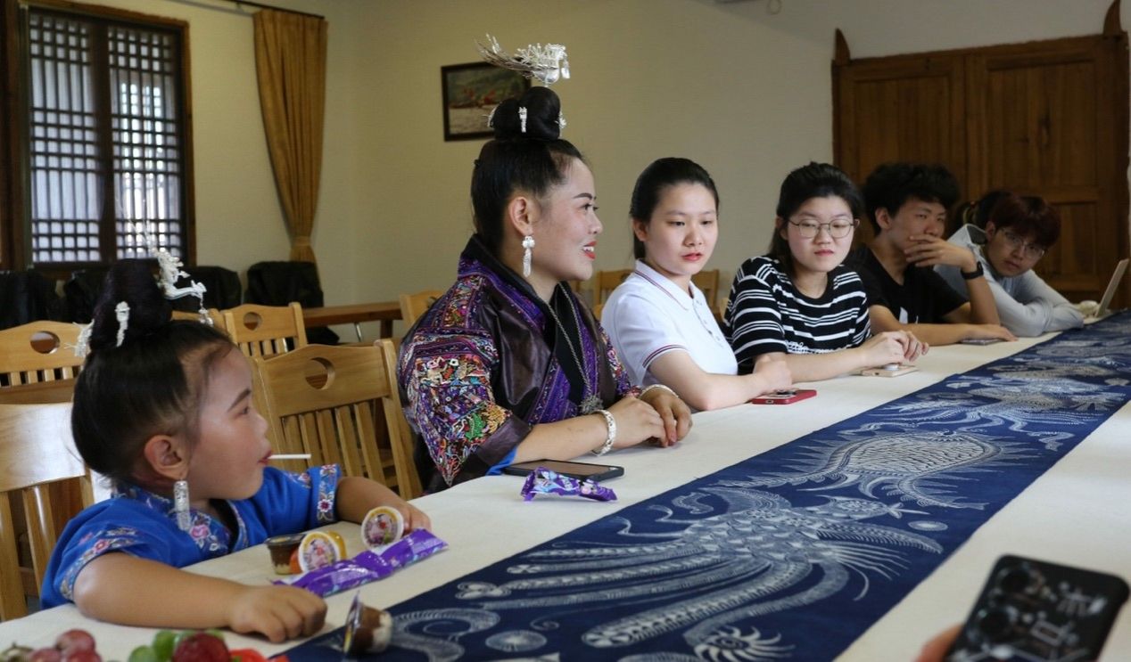 在会议室中,同学们对依贞进行了半结构式访谈。依贞的盛装最先引起大家的注意。她介绍,这是她与母亲共同缝制的盛装,已经有四十个年头。杨依贞还进一步向他们展示了更老一代盛装的照片。时间并没有在绣品上留下痕迹,老绣的针脚依旧细密,色彩依旧亮眼。这让他们对老绣产生了强烈的兴趣。“苗绣是个轮回。”依贞表示,一百多年前的审美,放在今天仍不过时。现今苗绣在纹样和配色上的创新,仍需要从老绣中汲取灵感与力量。汉族创新中华优秀文化的举措也如出一辙。近年来国潮兴起,《唐宫夜宴》、《祈》等国风舞蹈陆续“出圈”,惊艳四座,汉族人民也在传统文化的沃土中汲取创造创新的养分。