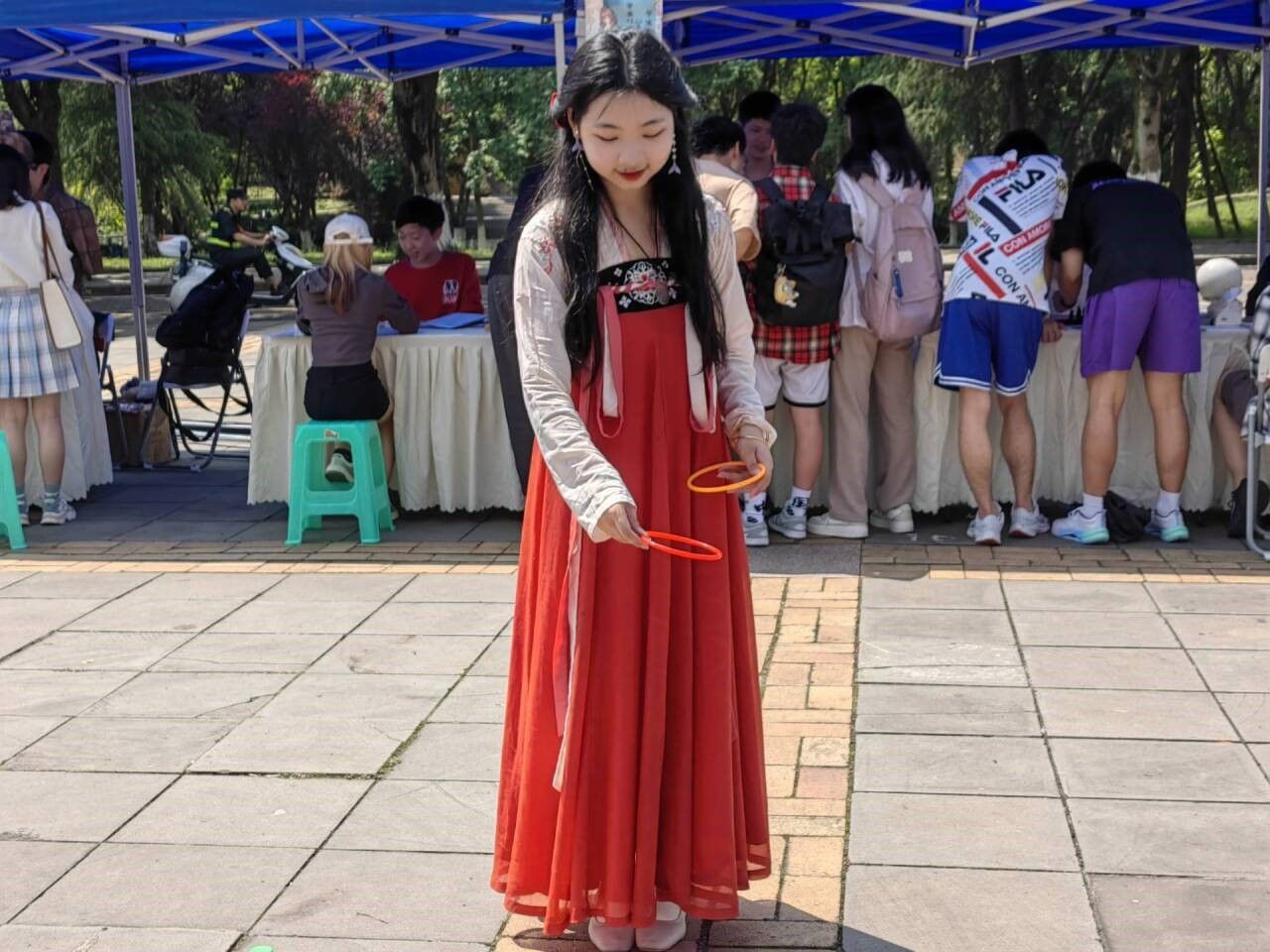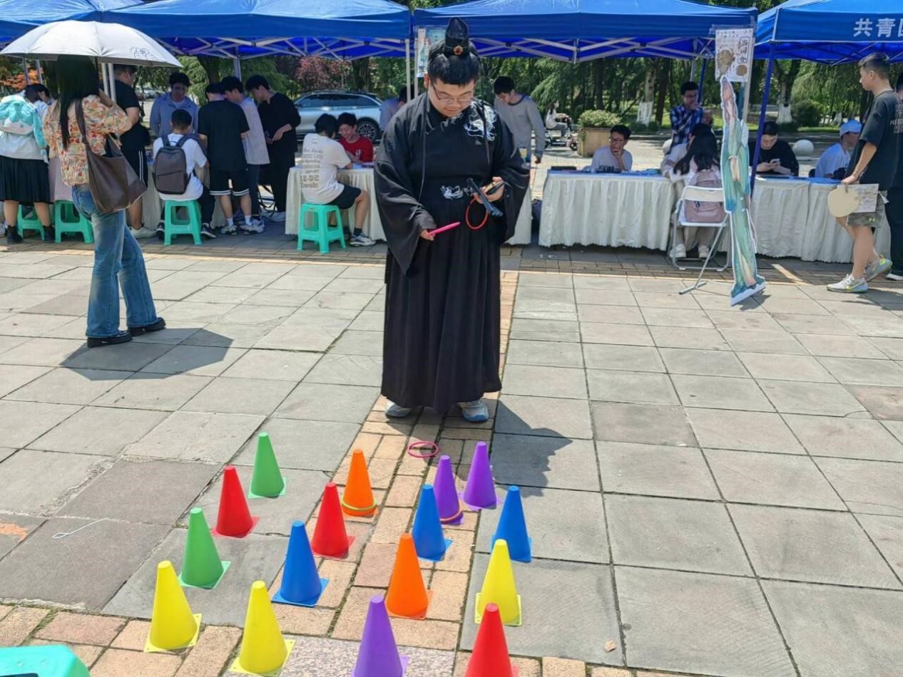 活动设置了秦朝、唐朝、宋朝、明朝四个板块,每个版块五个站点,每个站点都邀请了不同社团,社团可以根据主题设计相应的活动。博雅剧社设置了套圈和踢毽子两个活动,“套圈”是一种传统的民俗游戏,民国时期极为盛行,玩家站在指定线外用圈圈套住目标极为成功;“踢毽子”的由来可以追溯到汉朝,它起源于古代蹴鞠,经过不断演变逐渐形成了现代所见的毽子形态,唐宋时期是踢毽子的发展高峰期,这一活动在民间开始广泛流传。