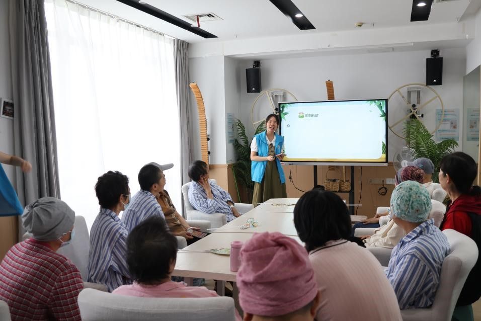 在活动正式开始前,志愿者们首先引导肿瘤患者有序入座,随后医院社工人员带领大家进行手势舞的热身游戏,这不仅迅速拉近了彼此的距离,也为接下来的环节营造了和谐温馨的氛围。