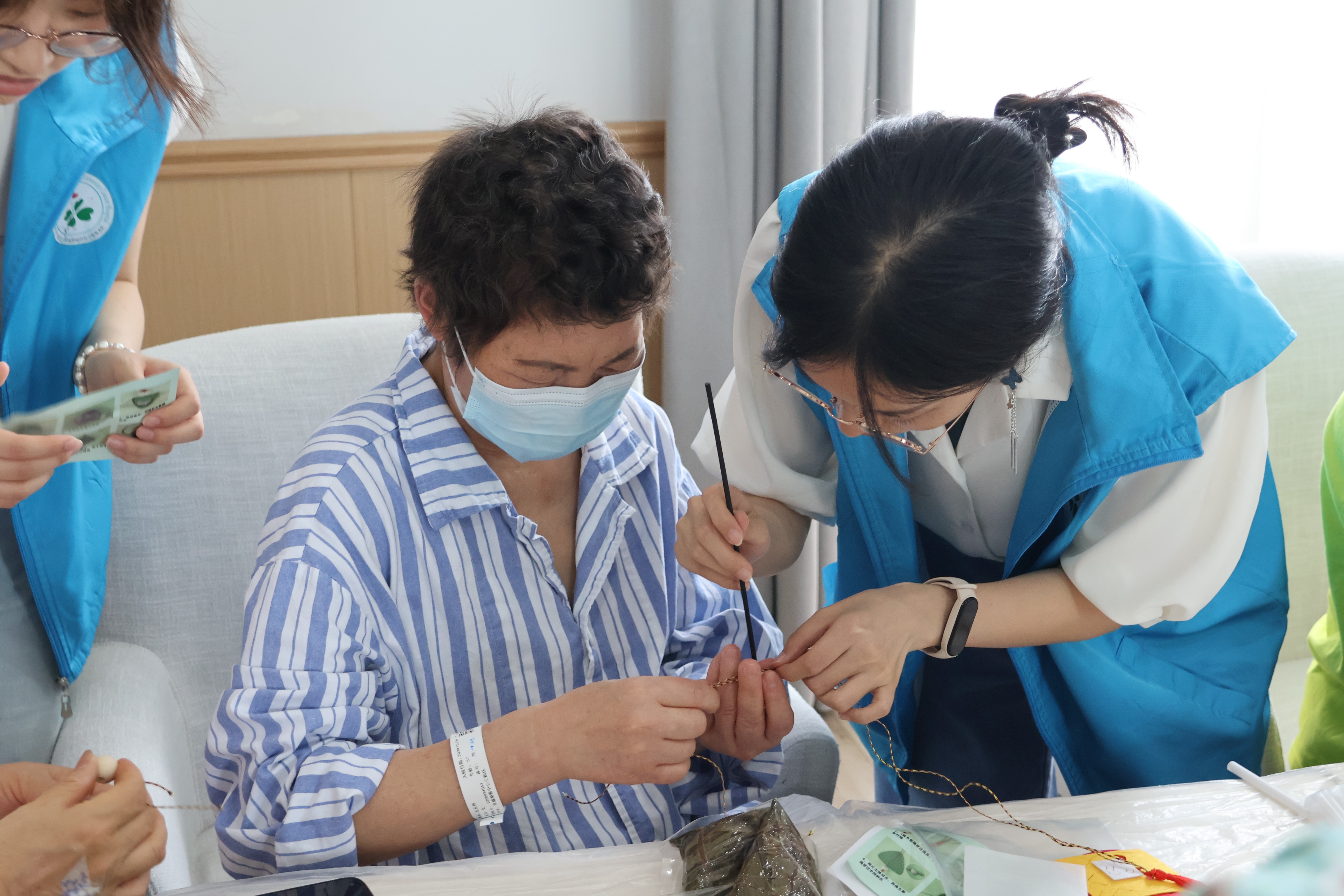 “有趣的端午习俗”环节将本次活动推向了高潮。趣味益智的“钓粽子”游戏吸引了患者们的积极参与,引发阵阵欢声笑语,台上参与者的专注与台下的欢呼鼓励交相呼应。在“手作香囊”过程中,志愿者和医院社工通力合作,根据香囊图纸一对一指导患者制作艾草香囊,并详细讲解了注意事项。小小的香囊既凝聚着传统中医的深厚智慧,也承载着人们对安全与健康的美好追求。完成香囊制作后,每个人手持自己的手工作品,脸上洋溢着发自内心的笑容,本次活动在大家的欢声笑语中落下了帷幕。