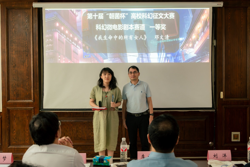 然后,是揭晓科幻微电影剧本赛道获奖情况的时间,第六届、第七届“朝菌杯”获奖者柏毅恒为剧本三等奖的获奖者们颁奖并宣读颁奖词,第十届“朝菌杯”高校科幻征文大赛组委会副秘书长张国威为剧本二等奖的获奖者们颁奖并宣读颁奖词,刘宇清老师为剧本一等奖的获奖者颁奖并宣读颁奖词。剧本一等奖得主,来自华东师范大学的邓文清亲自在现场分享了自己获奖的感受。