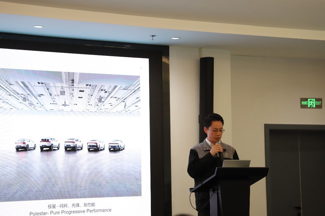 首先,极星汽车(重庆)党支部书记谢杏伟介绍极星汽车(重庆)有限公司现状及规划,并详细阐述了极星公司的特性——极简设计、尖端制造技术与先锋环保等理念。
