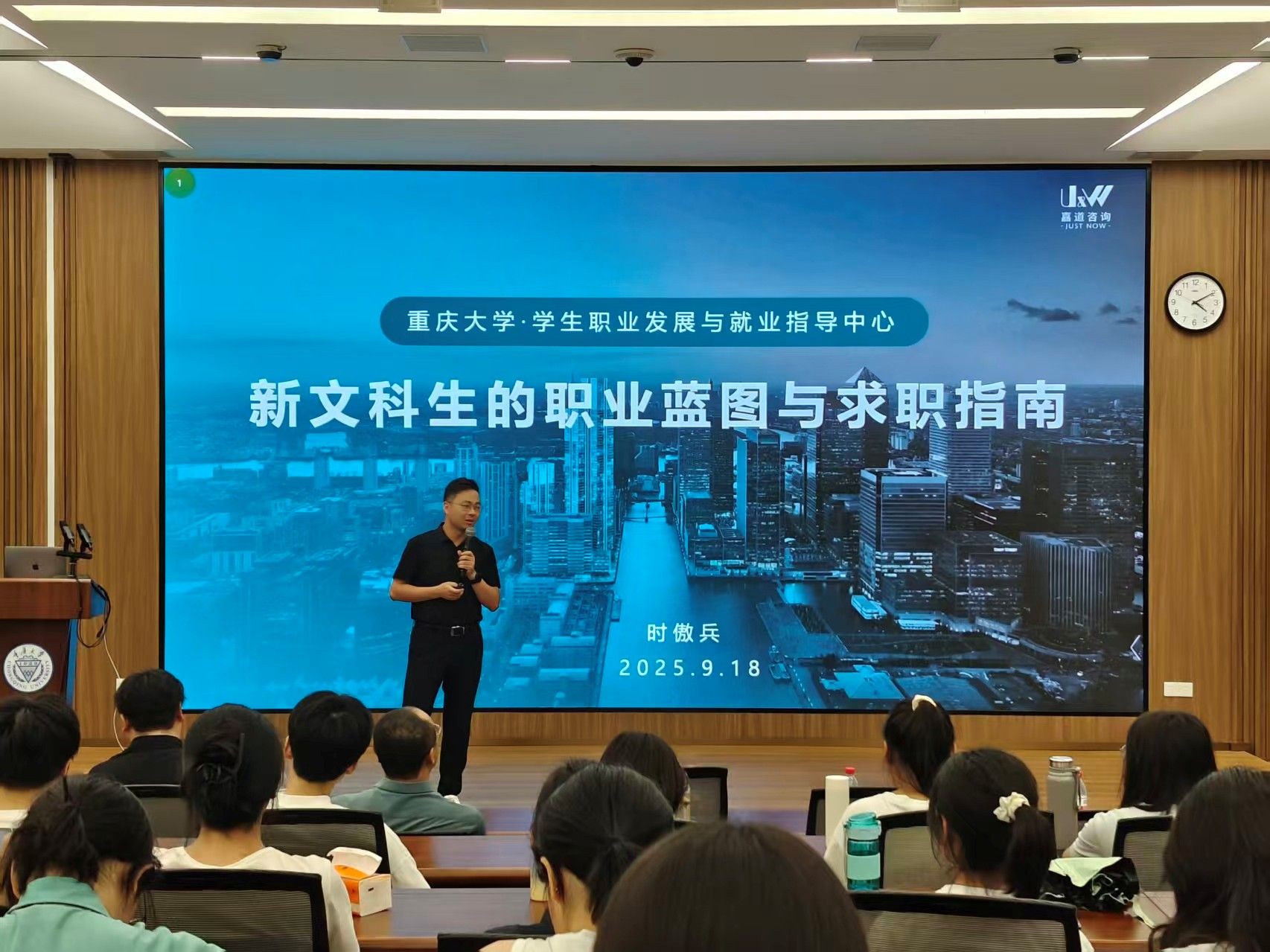 就业育人导师时傲兵在A区经管学院楼A101教室作题为“新文科的职业蓝图与求职指南”的专题分享。会议由视频网站