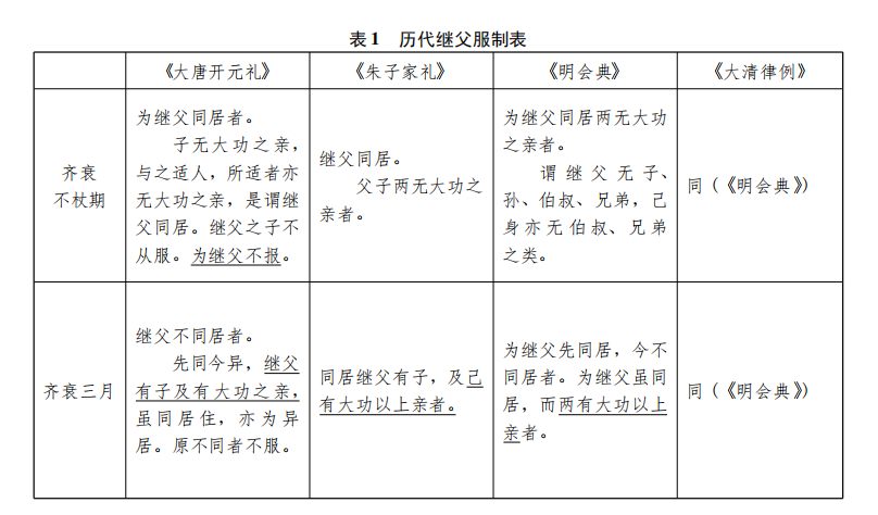 丧服制度的变化没有那么剧烈,但单向服丧的认定却是一以贯之的。从唐到清,都只有为继父的丧服,而没有为继子的丧服。现据徐乾学《读礼通考》绘制一张表格。[徐乾学:《读礼通考》,收入《景印文渊阁四库全书》,台北:台湾商务印书馆,1986年,第67—68页,第71页。]