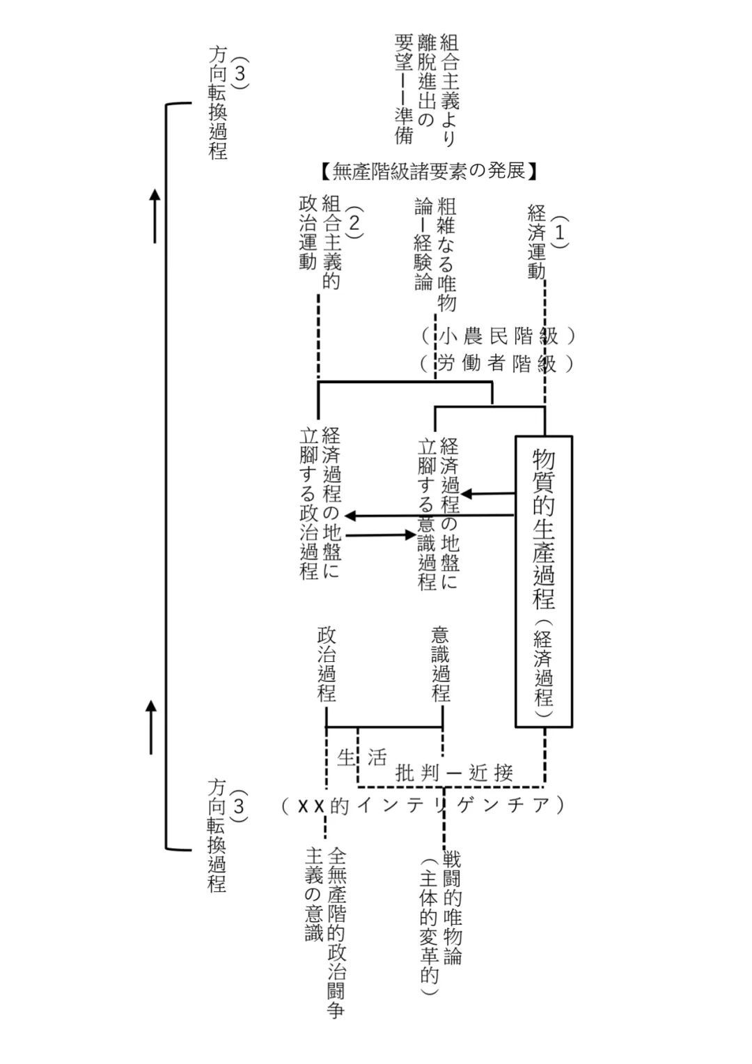 第三道转折,则是将“一切的知识者,在一定的条件之下,都可以参加无产阶级文学运动”的表述逐步推向“必须要有知识者要素的加入,将目的意识注入无产阶级中,才能产生无产阶级文学运动”。李初梨的方法是围绕“图2”提出更多阐释,从而强化智识阶级在“全无产阶级政治斗争”中的必要性。28仔细对照可以发现,“图2”与“图1”有相同的基本结构,都将社会构成过程拆分为意识过程、政治过程、生产过程三项。李初梨文中对此图的来源并无说明,但按照图式思路当仍与福本和夫有关。故有研究者认为,此图是“对福本‘社会变革过程底表式’中‘阶级斗争过程’(达到革命点以前)部分的模拟”30。但根据笔者考察,“图2”应当是李初梨从福本和夫另一本代表性著作《理论斗争》的“方向转换过程”(图3)图式删减而成。