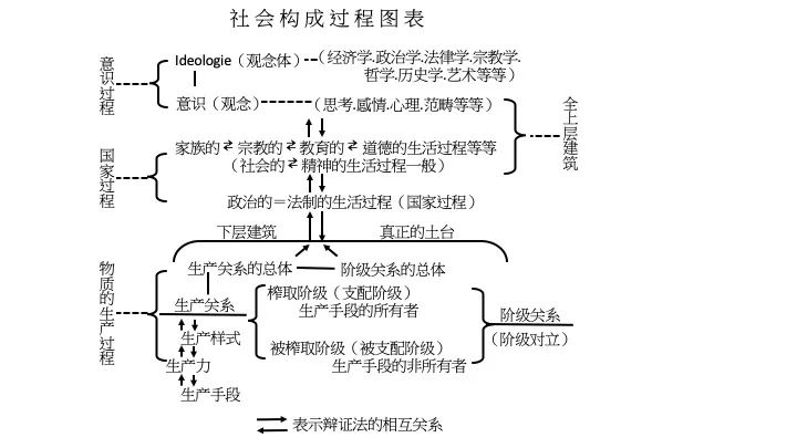 《自》文中使用“社会构成过程图表”(图1)说明社会的结构,用以论证无产阶级由于只能接触到“物质生产过程”,因此对上层建筑里五花八门的“国家过程”与“意识过程”内容无从得知,这便是挑夫故事中挑夫无法以“无产阶级意识”思考的原因。从而证明了他主张的“无产阶级的出身者,不一定会产生出无产阶级文学”的论点。