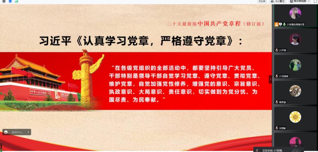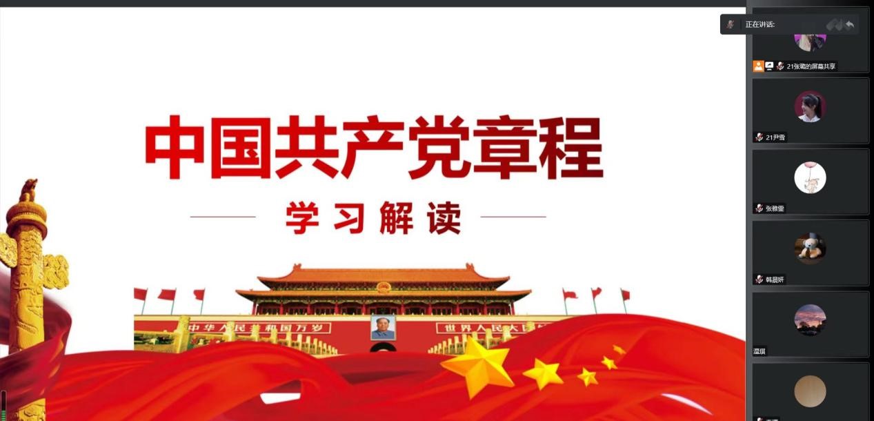 研究生二支部于2022年11月15日晚7点,以线上集体学习和线下自学相结合形式开展《中国共产党章程》专题学习。张璐同志担任活动主讲人,支部33名党员参加本次党日活动。