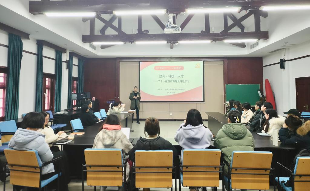 会上,赵耀文结合学院学科特色,从教育、科技和人才三大要点出发,重点结合科教兴国战略、人才强国战略和创新驱动发展战略,详细解读三大战略的工作目标以及新时代背景下的落实要求与途径,引领参会党员对党的二十大精神中内涵的教育理论进行深入解读。