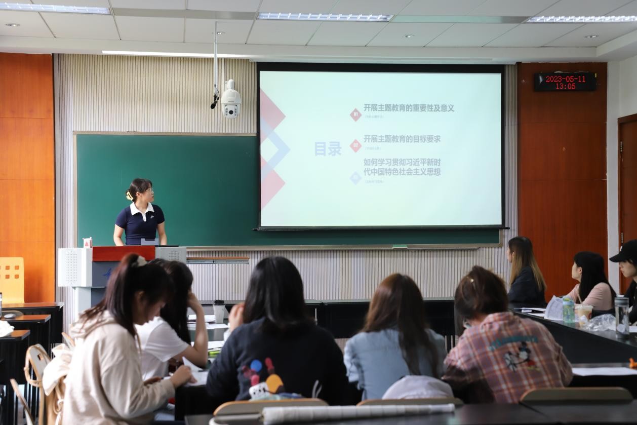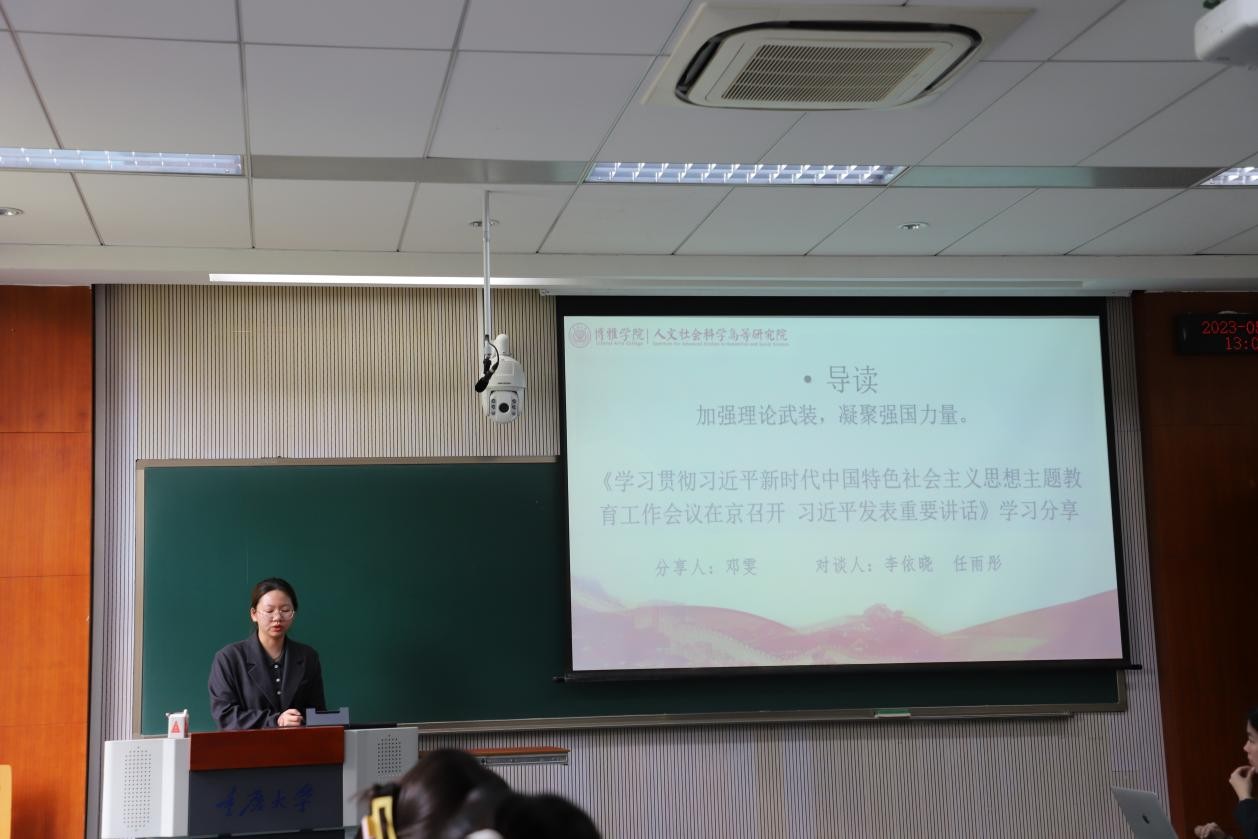 秉纲而目自张,执本而末自从。为深入理解习近平新时代中国特色社会主义思想,夯实思想根基,推动主题教育走深走实,作为本次活动汇报人,邓雯分享了自己关于学习贯彻习近平新时代中国特色社会主义思想主题教育工作会议的学习心得。邓雯从历史、实践、思想建设和现实工作方面展开论述,点明开展主题教育活动的重要性与意义,并进一步提出开展主题教育活动的根本任务和具体目标。最后,邓雯详细介绍了如何学习贯彻习近平新时代中国特色社会主义思想,号召大家在日常学习生活中“学思想、强党性、重实践、建新功”,加强理论学习,深化调查研究,不断用先进思想武装自己,争先创优。