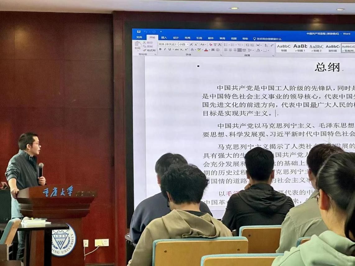 罗勇老师将《中国共产党章程》的总纲部分作为了本次学习的主要内容。他带领大家深入理解了党的性质、党的宗旨、党的指导思想等,重点讲述了中国共产党在不同历史时期形成的基本理论、基本方针和思想路线,帮助大家进一步了解了在新时代修改党章的重要意义。在学习过程中,罗勇老师向新生们推荐了《毛泽东选集》、《邓小平文选》等著作,鼓励大家要不断学习、积极思考、勇敢探索,学好、用好我党人民至上、敢于斗争、自我革命等宝贵的历史经验,将个人发展自觉融入到党和国家的发展中。