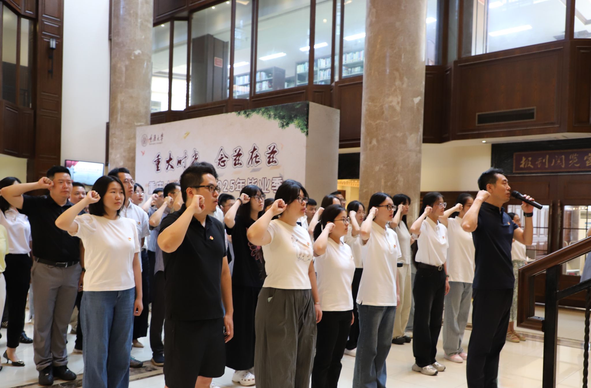 本次活动以“传承红色基因 践行初心使命”为主题,旨在引导全体党员坚定理想信念,永葆初心本色。上午九点半,宣誓仪式正式开始。活动由学院党委委员万曼璐同志主持,学院党委副书记姜雪峰带领全体预备党员进行了入党宣誓、老党员重温入党誓词,党员们佩戴党员徽章,面向党旗高举右拳,在领誓人带领下庄严宣誓。字字千钧的誓言回荡在宣誓大厅,表达出全体党员对党的忠诚和为共产主义事业奋斗终身的坚定决心。