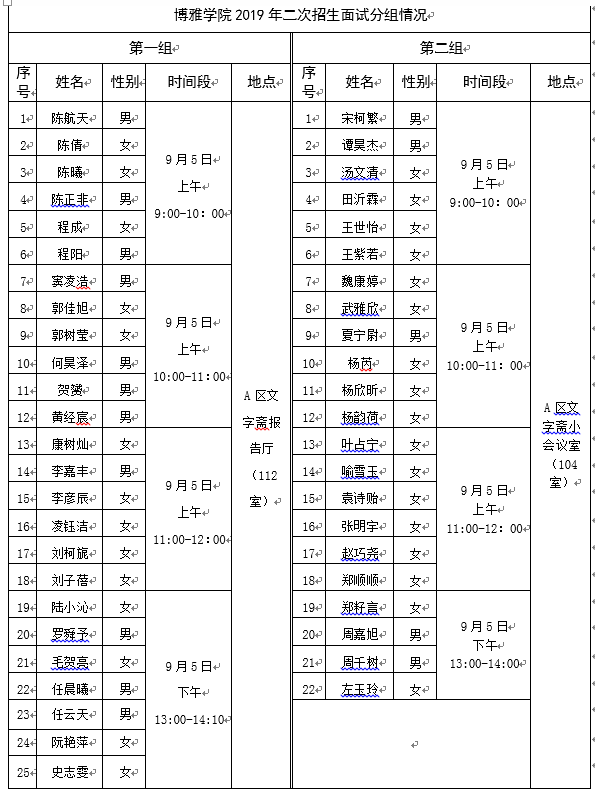 2019年二次招生面试分组情况”表。