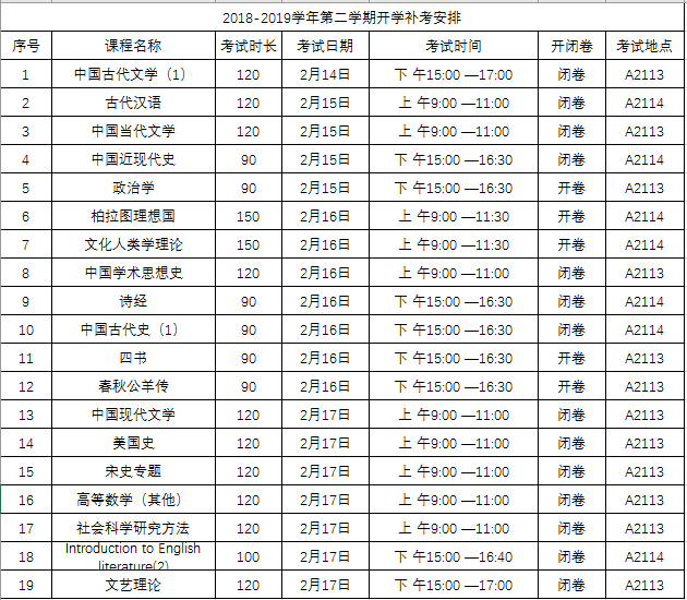 视频网站 2018-2019学年第二学期开学补考安排如下: