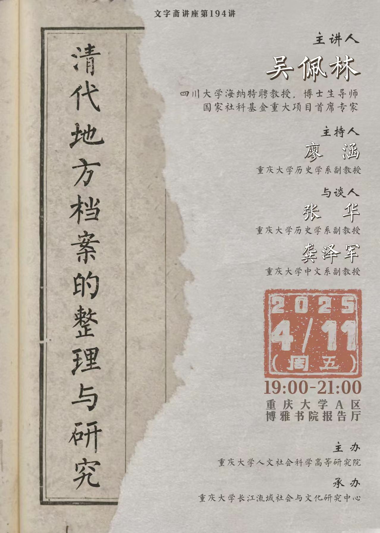 时间:2025年4月11日(星期五)19:00-21:00 地点:视频网站 A区博雅书院报告厅